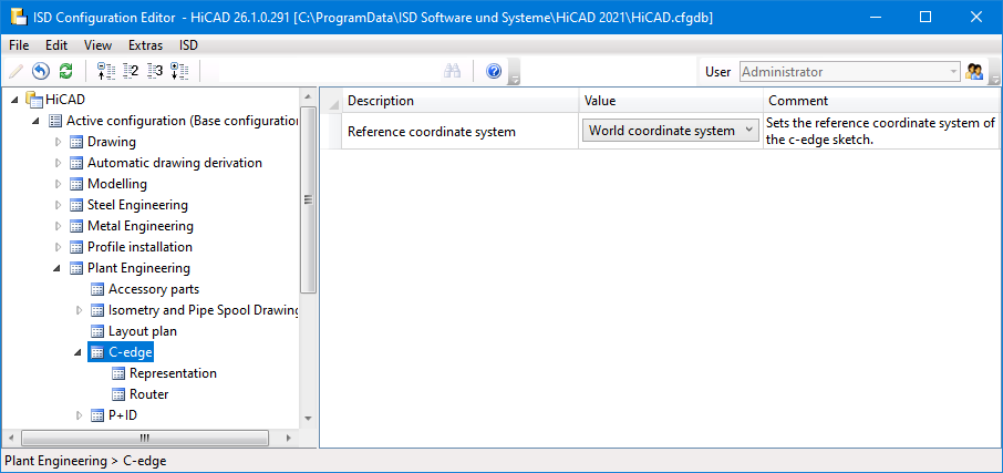 The behaviour regarding the sketch coordinate system of a guideline sketch can be defined in the Configuration Editor at Plant Engineering > C-edge via the Reference CS parameter.