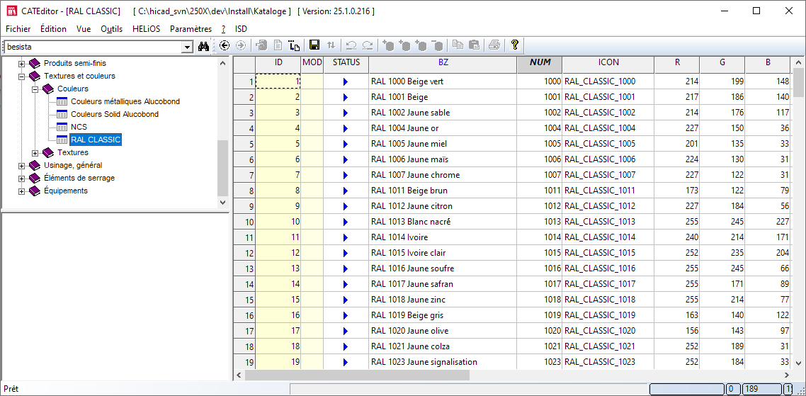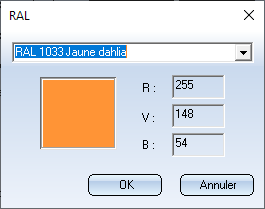 En cliquant sur le bouton RAL, vous accédez aux couleurs RAL du Tableau K3. Celles-ci sont définies dans le catalogue CATEditor sous Textures et couleurs > Couleurs > RAL CLASSIC.