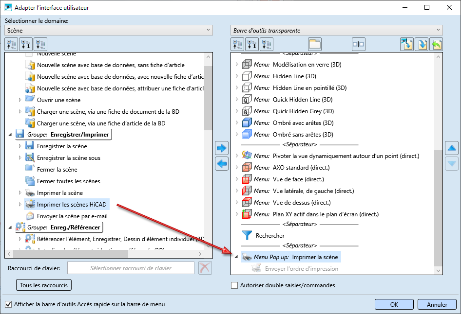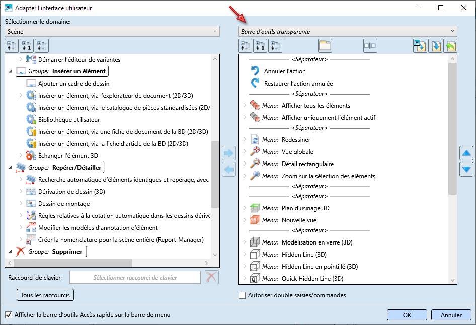 Sélectionnez à gauche sous Domaine la barre de menu de laquelle est issue la fonction que vous souhaitez transférer dans la barre d'outils transparente. Si vous avez supprimé des fonctions de la barre d'outils transparente prédéfinies par ISD et que vous souhaitiez la compléter, sélectionnez alors sous Domaine à gauche l'entrée Barre d'outils transparente.
