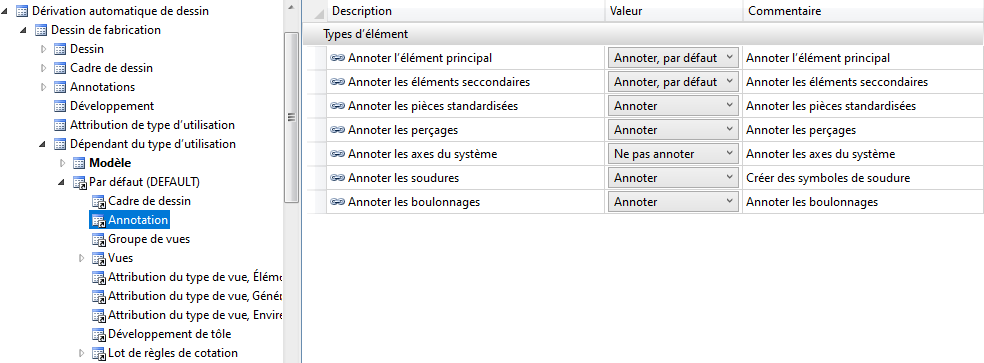 Si vous chargez les paramètres pour la dérivation de dessin d'une configuration, ce sont alors les paramètres spécifiés dans le Gestionnaire de Configuration qui seront utilisés pour le type d'utilisation correspondant sous Dérivation automatique de dessin > Dessin de fabrication > Dépendant du type d'utilisation > name > Annotation. name représente le nom de chaque type d'utilisation.