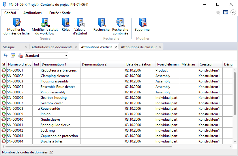 De plus, les onglets Attributions de documents et d'articles donnent des informations sur les documents (par ex. la scène et les dessins de fabrication) et les articles (ensembles, profilés, tôles, etc.) liés au projet actif.