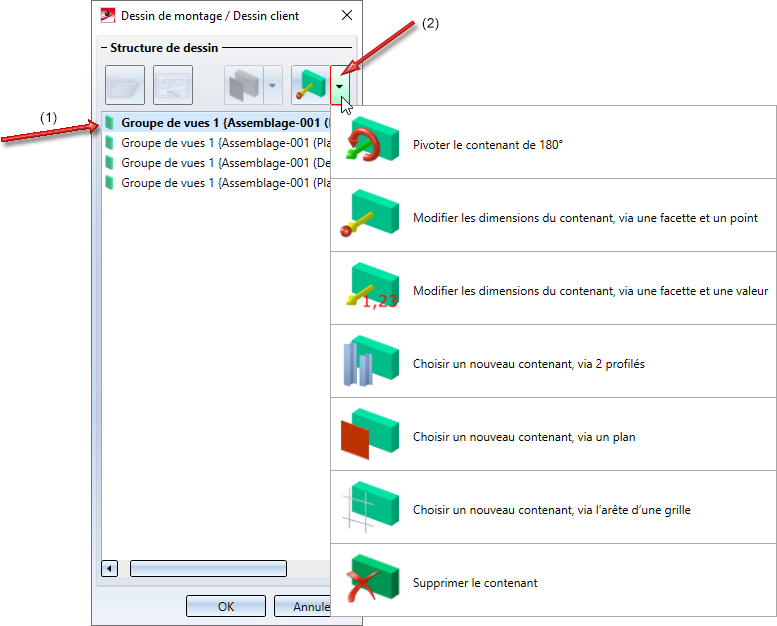 Pour modifier la vue de détail ou les contenants d'un dessin de montage/client ou pour supprimer des contenants, sélectionnez d'abord le dessin souhaité dans la liste (1). Ensuite, sélectionnez dans le menu contextuel (2) la fonction souhaitée .