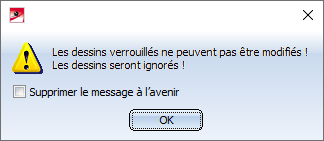 - Les dessins déjà validés et donc verrouillés ne peuvent pas être modifiés avec cette fonction. Dans ce cas, apparaît tout d'abord le message suivant :