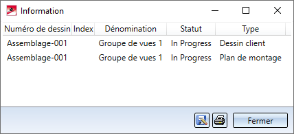 Après l'appel de la fonction, une fenêtre de dialogue s'affiche avec une liste des dessins de montage et de client appartenant à la scène en cours.