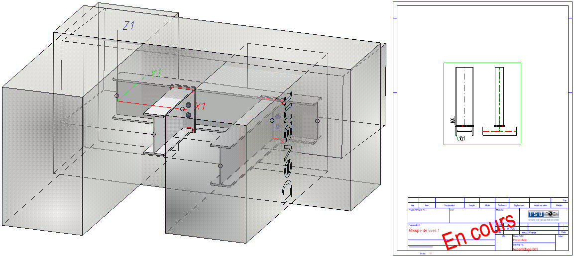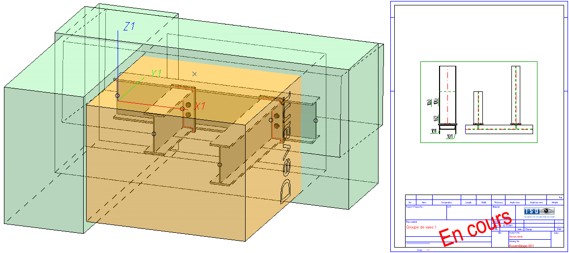 Après avoir quitté la fenêtre de dialogue en cliquant sur OK, les modifications sont prises en compte. Pour actualiser les dessins de montage et de client correspondants, la modélisation doit d'abord être repérée et enregistrée. Si vous n'avez modifié que des dessins client, il suffit d'enregistrer la modélisation.
