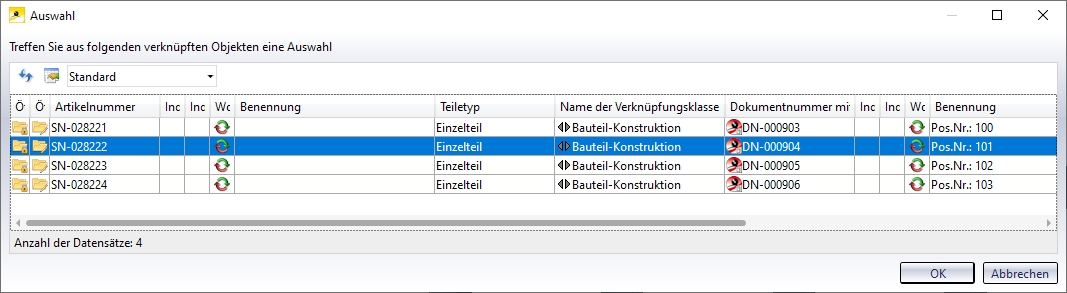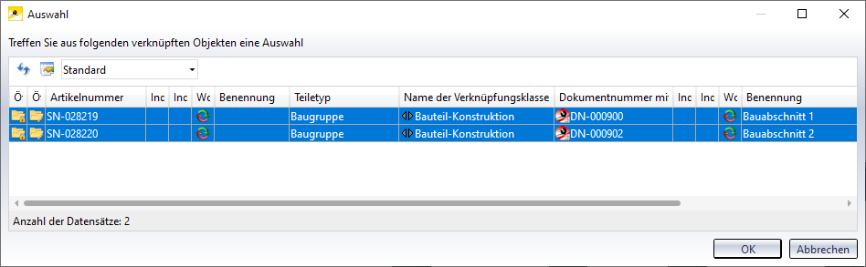 - Haben Sie die Funktion im Gesamtmodell aufgerufen, dann wählen Sie zunächst die Bauabschnitte in denen das Teil gesucht werden soll und die gewünschten Einzelteile.