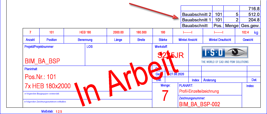 Die Bauabschnittsliste wird die in die Einzelteilzeichnung eingefügt.