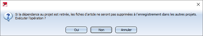 Si vous cliquez sur Oui, la dépendance du projet est supprimée. De cette manière, l'ensemble est défini comme un élément de réutilisation. Il conserve donc sa fiche d'article même s'il est inséré dans d'autres projets.