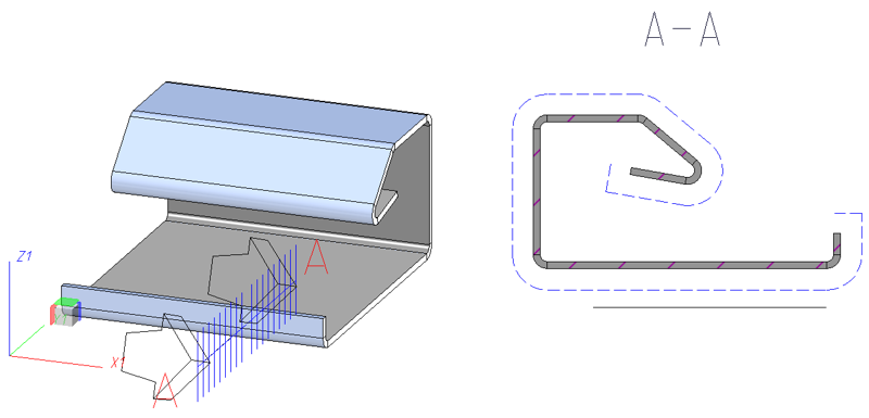 Pour obtenir la découpe (projection développée) de l'élément de tôle modélisé, HiCAD Tôle 3D vous permet une projection développée selon plusieurs procédés de calcul qui prennent en compte les modifications de longueur de la pièce qui, en fonction du matériau, surviennent lors de son pliage.