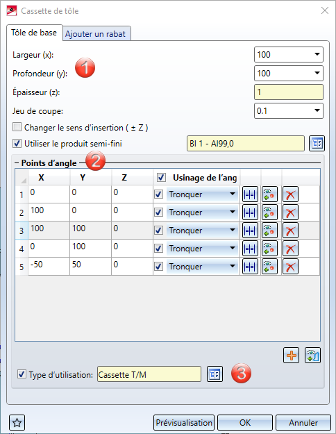 Vous avez la possibilité de modifier la forme de votre tôle de base dans l'encart Points d'angle en ajoutant d'autres points