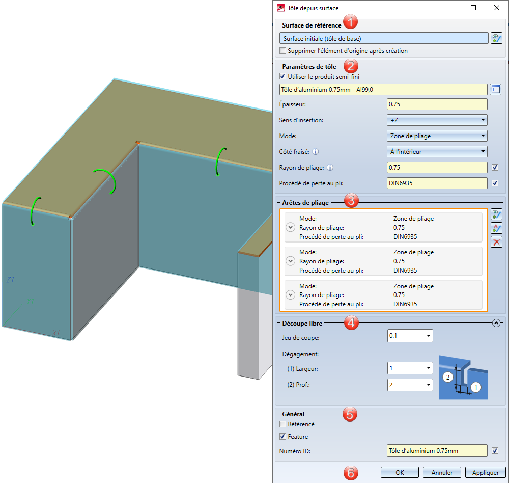 Après avoir saisi toutes les données nécessaires, la nouvelle tôle peut être insérée. En cliquant sur Appliquer ou par un clic sur la molette de la souris (BMS), l'élément de tôle est inséré, mais la fenêtre de dialogue reste ouverte, c'est la différence avec le bouton OK. Vous avez ainsi encore la possibilité de modifier les données et avec Appliquer générer un autre élément de tôle. Si vous quittez la fenêtre de dialogue par le bouton Annuler, la fonction sera terminée sans insertion ou modification.