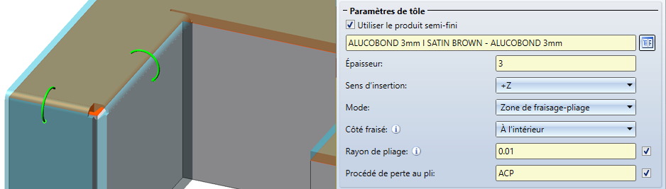 - Indiquez l'épaisseur de la tôle, le sens d'insertion et le mode (Zone de pliage ou Zone de fraisage-pliage) dans l'encart de la fenêtre.