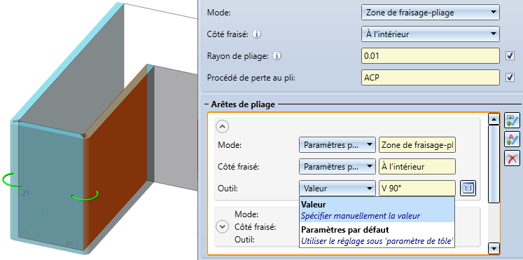 Pour une Zone de fraisage-pliage, le Mode, le Côté fraisé et l'Outil (issu du catalogue) peuvent être modifiés si vous sélectionnez "Valeur" à la place de "Paramètres par défaut".