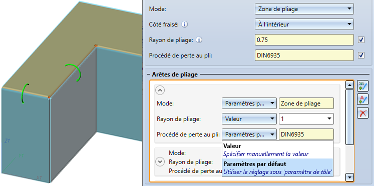 Pour une Zone de pliage, le Mode, le Rayon de pliage et le Procédé de perte au pli peuvent être modifiés si vous sélectionnez "Valeur" à la place de "Paramètres par défaut".
