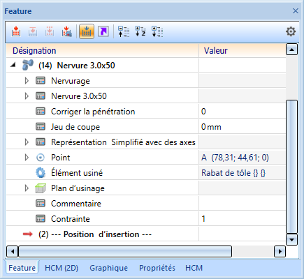 La forme est intégrée dans l'historique du Feature de l'élément de tôle et peut par un double-clic sur, par ex., l'entrée "Nervure 3.0x50" être modifiée.