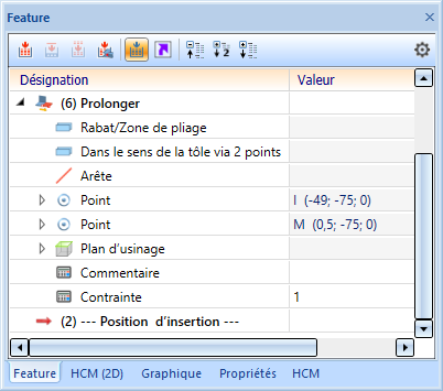 Marche à suivre pour le prolongement dans le sens de la tôle par la saisie d'une valeur :