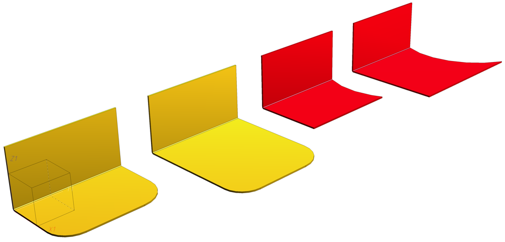 Avec l'aide des fonctions du groupe Modification de longueur, vous pouvez à volonté allonger ou, en indiquant une valeur négative, raccourcir les tôles et les zones de pliage. Vous pouvez allonger les tôles dans le sens de la tôle ou dans le sens d'une coordonnée. Pour l'allongement d'une tôle dans le sens d'une coordonnée, les valeurs s'appliquent au système de coordonnées actif.