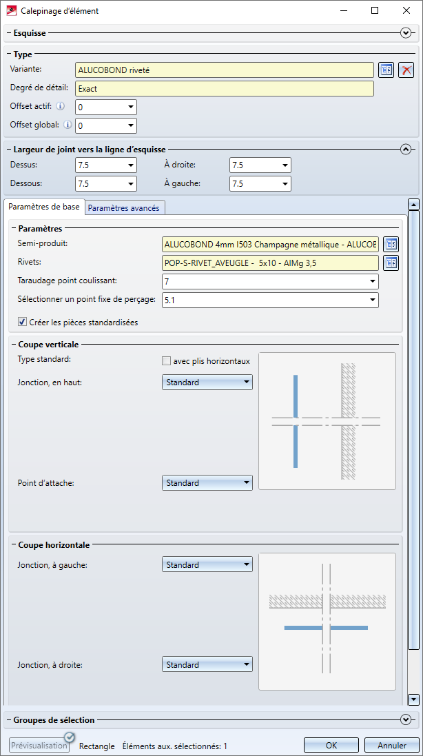 Fenêtre de dialogue ALUCOBOND riveté - Paramètres avancés