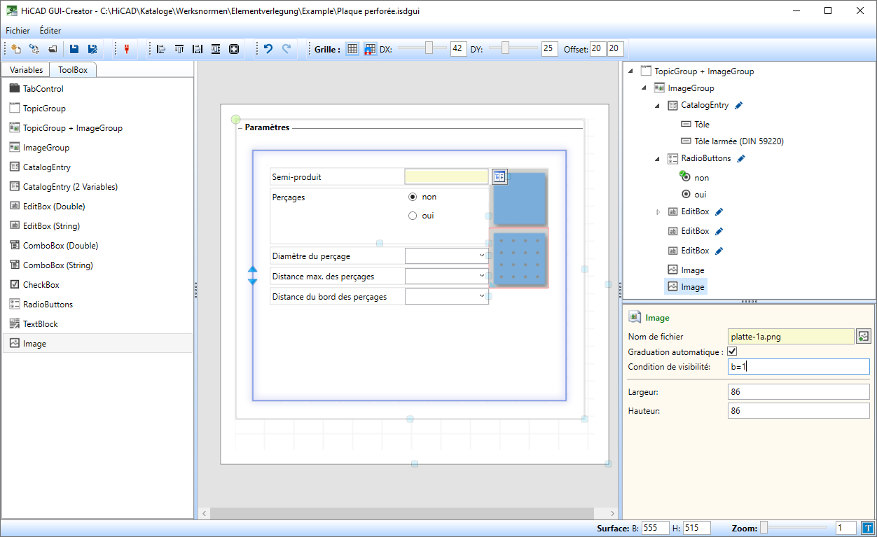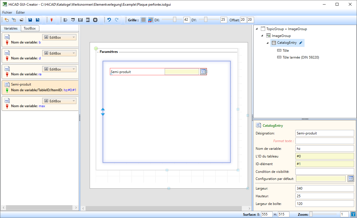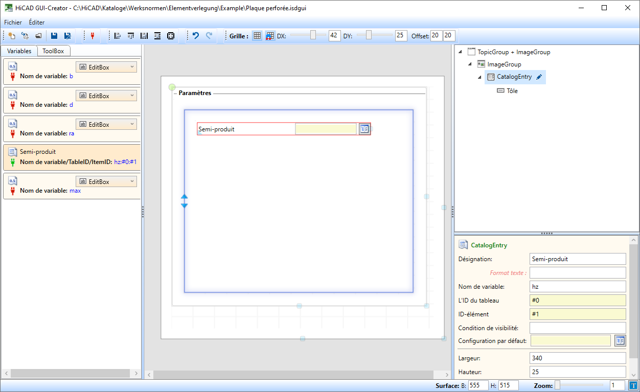 HiCAD GUI-Creator • Calepinage d'élément • Éditeur de Catalogue
