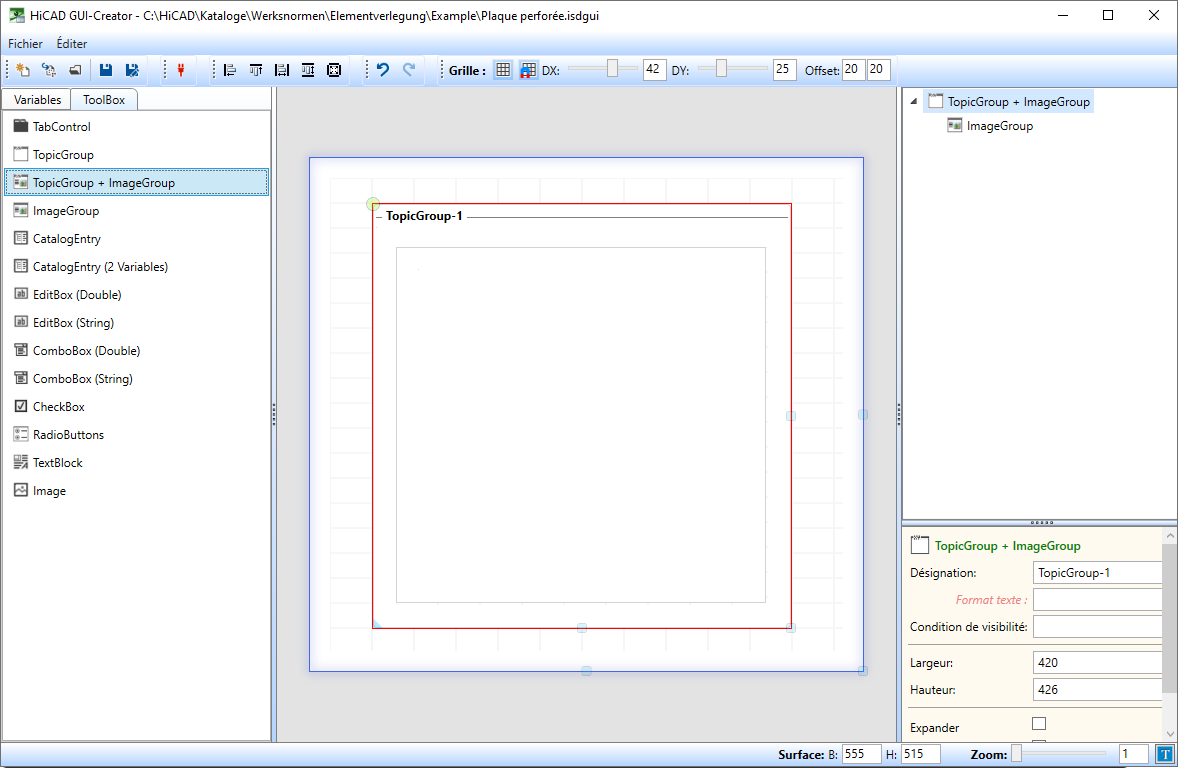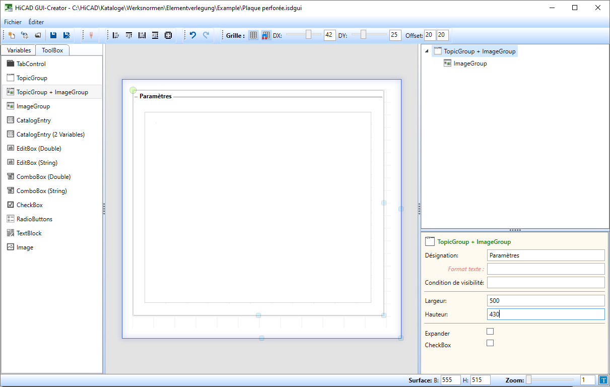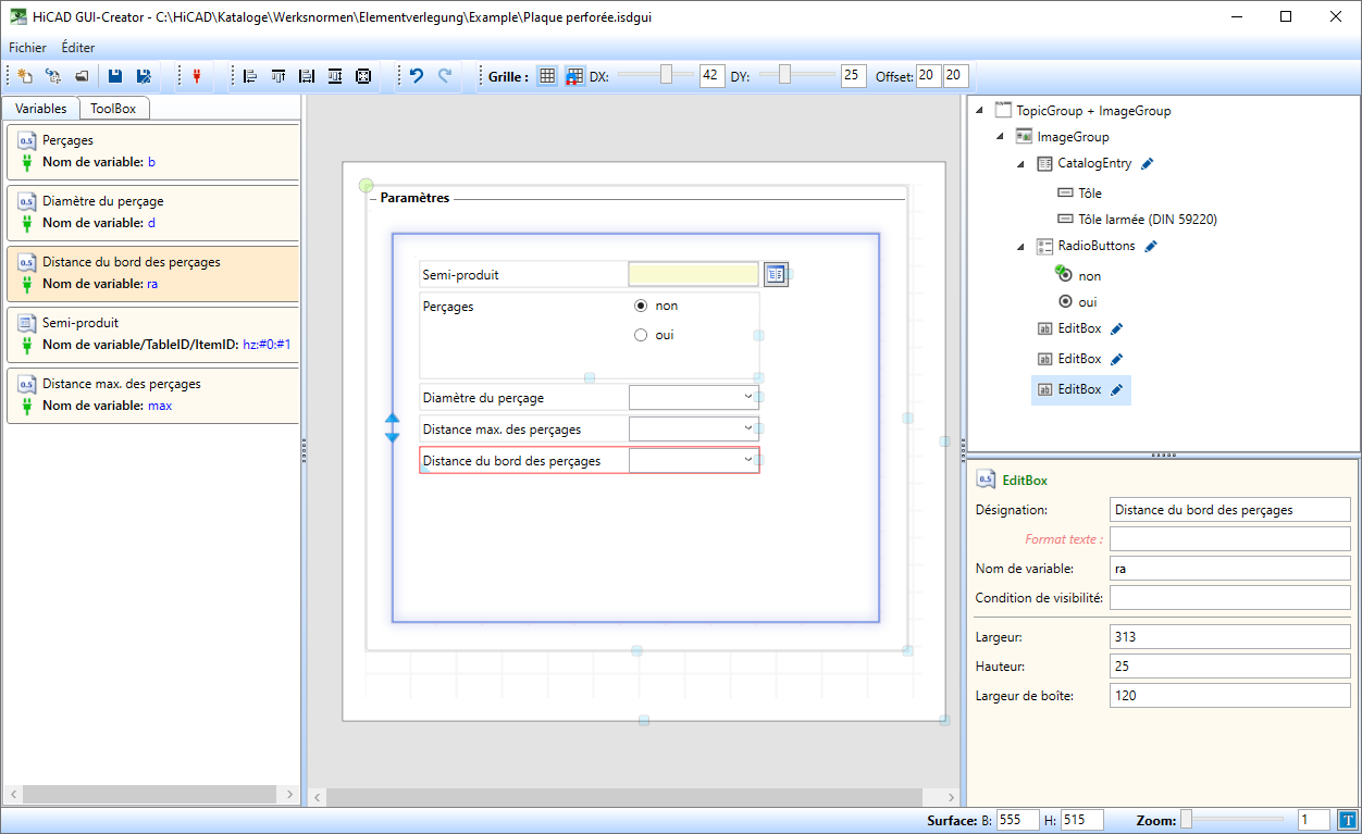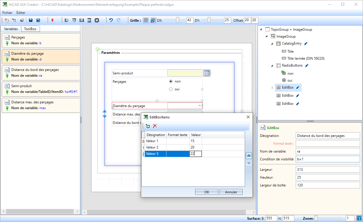 HiCAD GUI-Creator • Calepinage d'élément • Éditeur de Catalogue