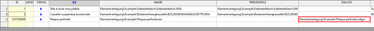 Pour pouvoir utiliser le dialogue, il faut encore attribuer dans l'Éditeur de Catalogue l'élément de calepinage correspondant en saisissant le nom du dialogue (avec chemin relatif) dans la colonne DIALOG, par exemple :