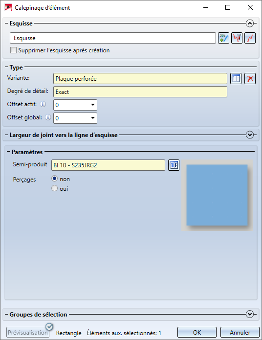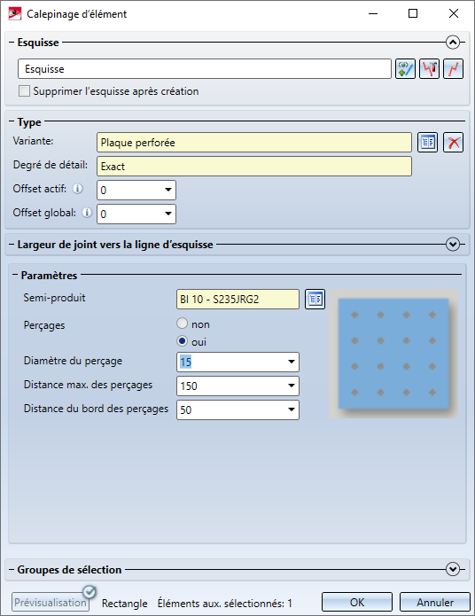 On peut maintenant enregistrer le dialogue. Le fichier est stocké automatiquement dans le répertoire Katalog Werksnormen\Elementverlegung\Example sous le nom Plaque perforée.isdgui.
