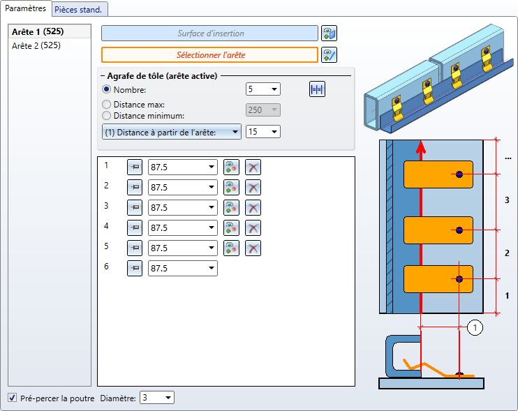 Le nombre et les distances des agrafes de tôle peuvent être déterminés automatiquement de trois manières :