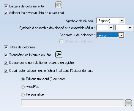 Vous pouvez définir ici les paramètres d’exportation de la liste de quantités ou de structures vers un fichier texte.