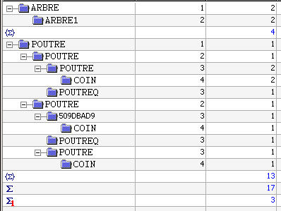 La somme des entrées visibles de tous les niveaux est calculée (p. ex. pour le calcul du poids dans les constructions de tuyauteries et de charpentes métalliques, où les entrées du poids de chaque élément sont indiquées). Identifiant : ∑