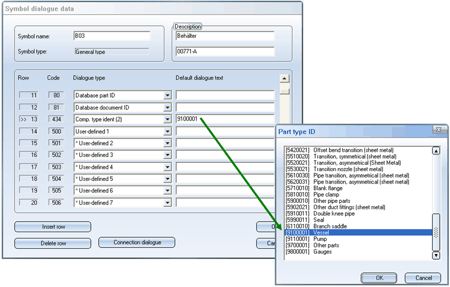 When a part is assigned from the database to an P+ID symbol, the Part type ID can be used as the search criterion. This ensures that only suitable parts are offered for selection. It is therefore important that a suitable entry exists in the P+ID symbol data mask for the Part type ID dialogue.