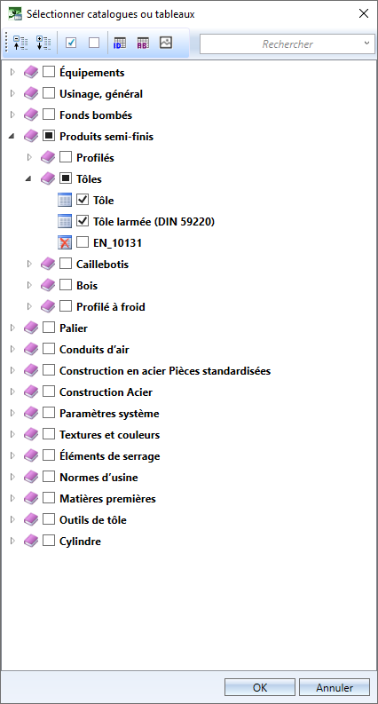 Les catalogues ou tableaux, qui seront proposés ensuite à la sélection dans le dialogue utilisateur, peuvent être spécifiés par un clic sur le symbole