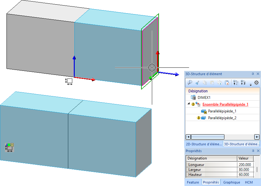 Un 2ème parallélépipède est maintenant inséré comme élément secondaire de l'ensemble. Les dimensions de l'ensemble sont corrigées.