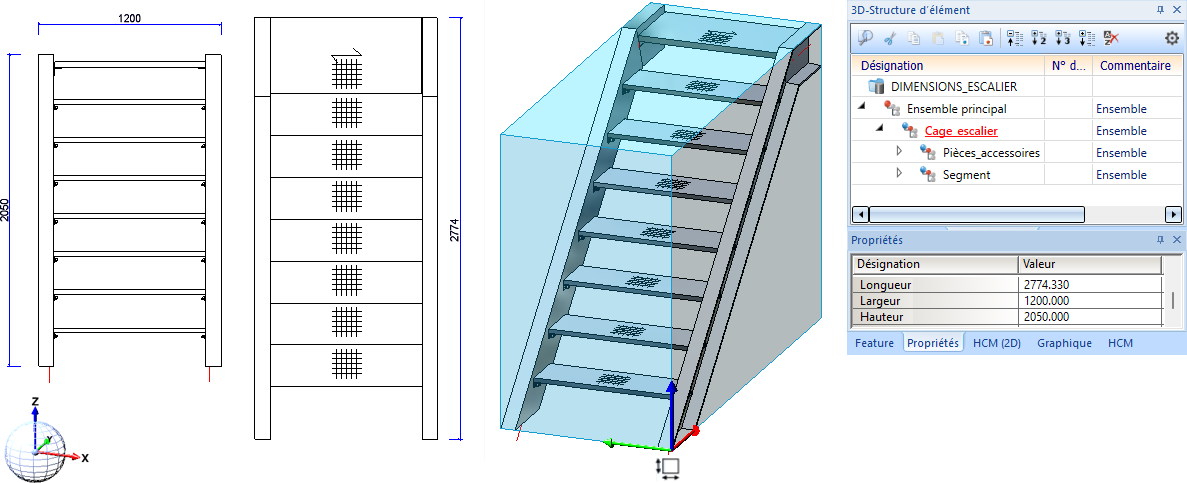 L'illustration ci-dessous montre un ensemble (cage d'escalier) avec calcul automatique des dimensions.