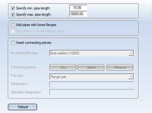Setting options for automatic insertion of connecting parts between straight pipes, if the guideline is longer than the maximum pipe length (supplied length).