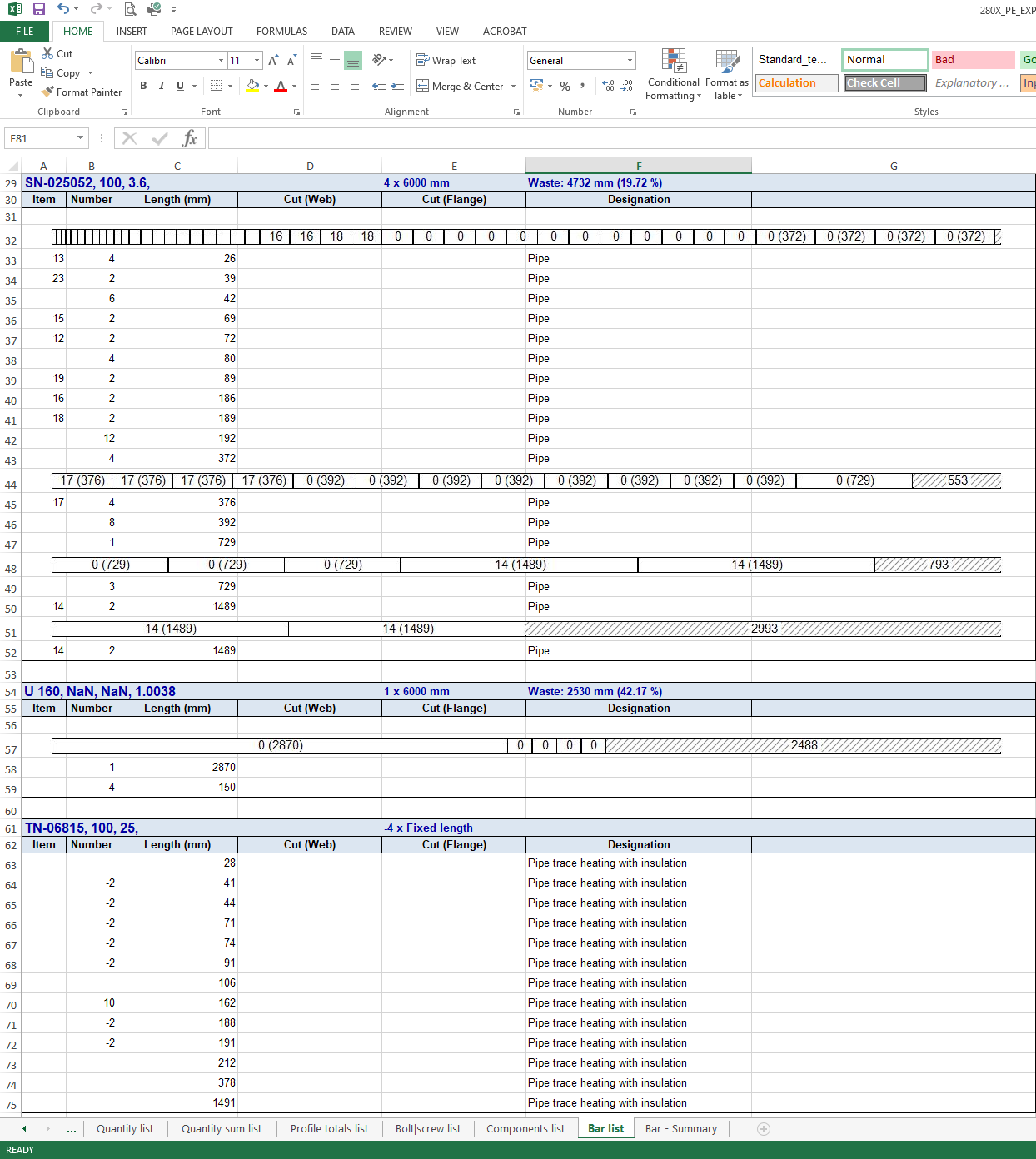 Excel-BOM with pipe length list
