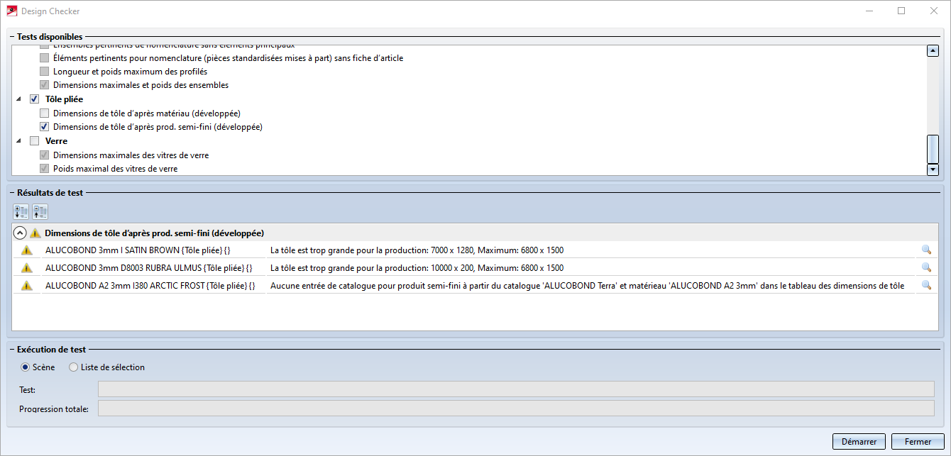 Ce test permet de rechercher toutes les tôles de la liste de sélection actuelle ou de l'ensemble de la scène pour lesquelles il n'a pas encore été défini quelle vue de la tôle doit être la vue de face ou la vue de dessus lors de la dérivation du dessin.
