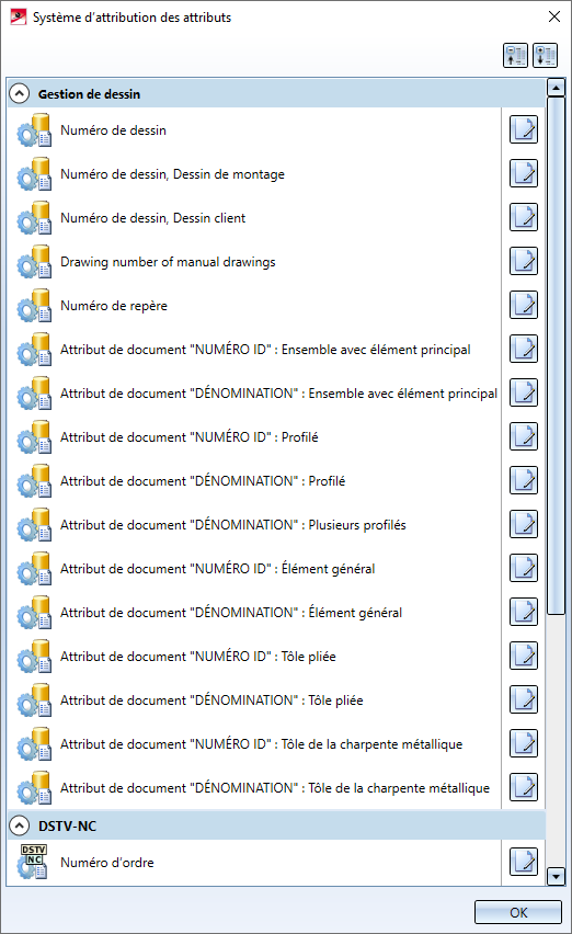 Pour l'exportation DSTV-NC, vous pouvez également utiliser des fichiers de modèle pour la composition du numéro de dessin, du numéro d'élément, du numéro de repère ou du numéro d'ordre et les adapter de façon individuelle.