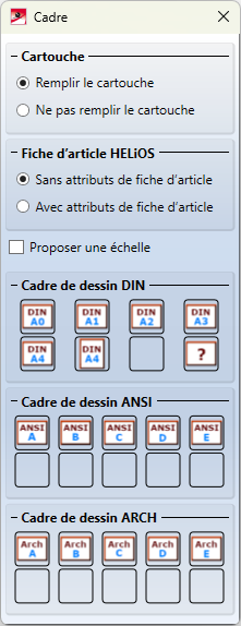 - L'ajout d'un cadre de dessin peut être effectué à partir du groupe de fonctions Repérer/Détailler. Les fonctions pour remplir le cartouche sont disponibles dans le menu déroulant de la fonction Cadre.