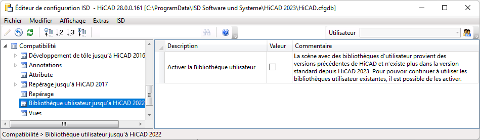 Lors d'une mise à jour d'une version antérieure à HiCAD 2023, la bibliothèque utilisateur reste activée pour les clients qui l'utilisaient. Lors d'une mise à jour ultérieure à HiCAD 2023, le paramètre sélectionné dans le Gestionnaire de Configuration sera transféré.