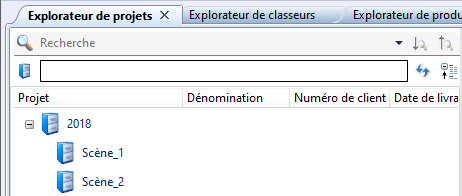 Dans la pratique, il arrive également souvent de travailler avec l'arborescence des projets, c'est-à-dire avec des sous-projets. À titre d'exemple, toutes les scènes d'une même année (par ex. 2018) pourront être rangées dans le Projet 2018. Les scènes en elles-mêmes de cette année seront attribuées aux sous-projets correspondants. Cette arborescence peut également être constituée directement via la Gestion de dessin. Pour cela, créez tout d'abord un projet avec le nom 2018 avec l'attribution indépendamment au projet. Pour les scènes, créez ensuite pour chacune un sous-projet avec l'attribution 2018, par exemple :