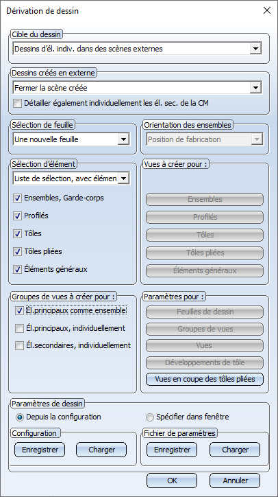 , les paramètres (c'est-à-dire pour les feuilles de dessin, les groupes de vues, les vues, etc.) pour la création des dessins d'exécution/d'élément individuel ne seront pas ici spécifiés dans une fenêtre, mais ils seront chargés à partir de fichiers paramétriques. Cela signifie que pour cette fonction la fenêtre de dialogue Dérivation de dessin ne vous apparaîtra pas. Ce qui au final accélère le processus de création des dessins.