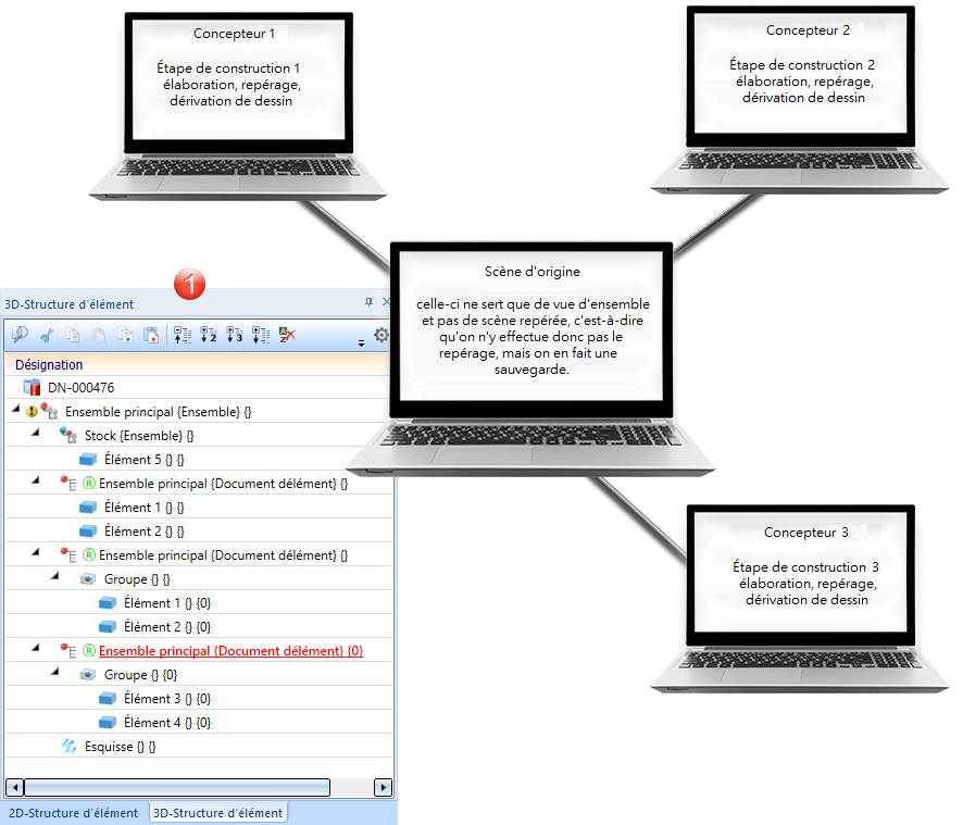 La scène d'origine est divisée en ensembles de structure appropriés et enregistrée sans repérage. Les ensembles de structure sont enregistrés individuellement en tant que dessins d'élément individuel référencés en externe. Ces dessins d'élément individuel référencés en externe peuvent ensuite être modifiés et enregistrés - mais non repérés - sur différents postes de travail. Après l'achèvement de tous les ensembles de structure, la scène d'origine sera actualisée. Le repérage de tous les ensembles de structures et les dérivations de dessins se feront alors dans la scène d'origine ; en d'autres termes, la scène d'origine sert ici de modélisation source pour le repérage.