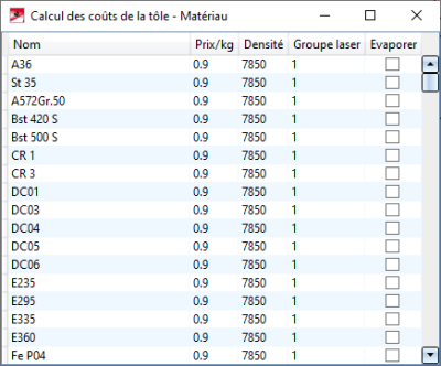 La liste des matériaux du catalogue peut être modifiée au moyen de l'outil propre SmCostConfig.exe (répertoire .exe).
