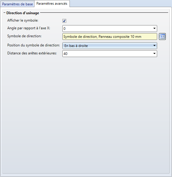 Cochez la case Afficher le symbole pour faire apparaître sur le dessin un symbole d'usinage. Vous pouvez en plus indiquer par l'Angle par rapport à l'axe X la rotation du symbole, sélectionner du catalogue un Symbole de direction, définir la Position du symbole de direction sur l'élément, ainsi que la Distance des arêtes extérieures.