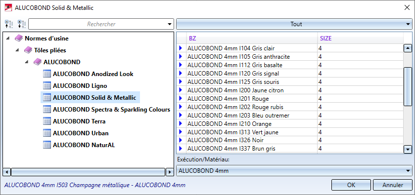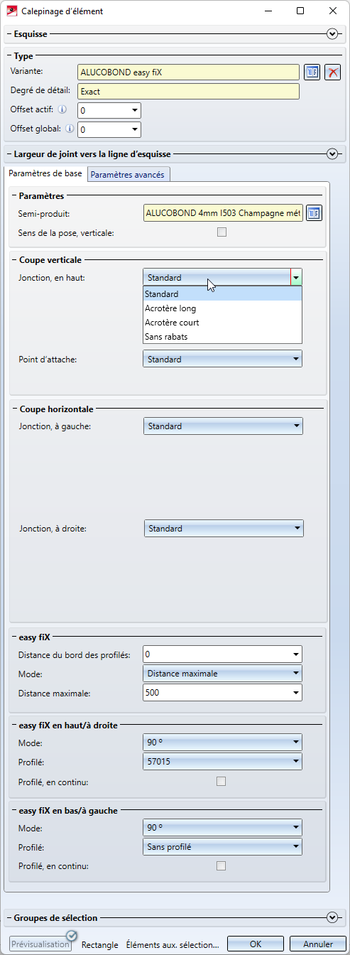 Les paramètres pour les éléments ALUCOBOND® easy fiX sont divisés en deux onglets :