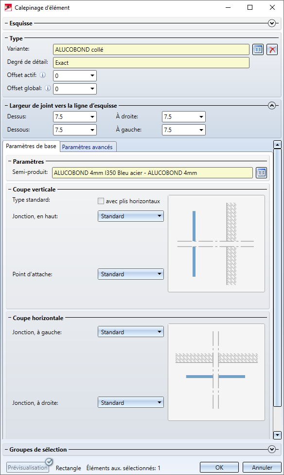 Fenêtre de dialogue ALUCOBOND collé - Paramètres de base