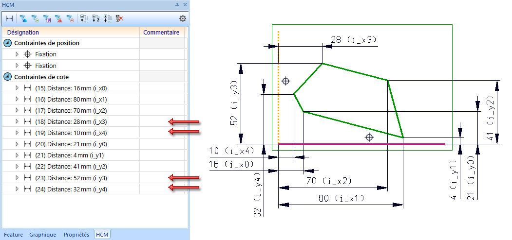 Changez pour cela dans la fenêtre HCM les contraintes pour les points d'angle (par un double-clic) de la façon suivante :