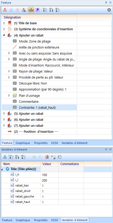 Nous travaillons ici avec la variante (fictive) ISD-17, qui est basée sur une simple tôle rectangulaire. Elle est stockée dans le dossier du catalogue dans un dossier WERKSNORMEN\ELEMENTVERLEGUNG\EXAMPLE\ISD-17. Outre les variables i_h et i_l, que le calepinage d'élément utilise pour configurer la taille des éléments, les variables rabat_haut, rabat_bas, rabat_gauche et rabat_droit sont également disponibles. Elles peuvent être de valeur 0 ou 1 et contrôler si un rabat de tôle doit être présent sur un côté de la tôle (1) ou non (0).