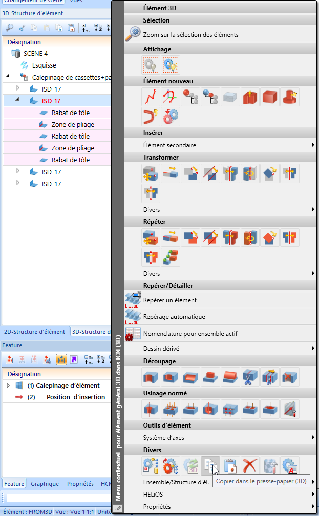 Une nouvelle scène doit être copiée. Par un clic droit sur l'élément dans l'ICN suivi d'un clic sur Divers > Copier dans le presse-papier, nous copions l'élément dans le presse-papier de HiCAD.