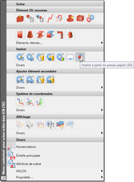 Nous créons ensuite une nouvelle scène via Scène > Nouveau. Nous y insérons un ensemble principal via Standard 3D > Nouveau > Ensemb. > Ensemble principal. Ensuite nous insérons l'élément copié via clic droit > Insérer > Insérer à partir du presse-papier.